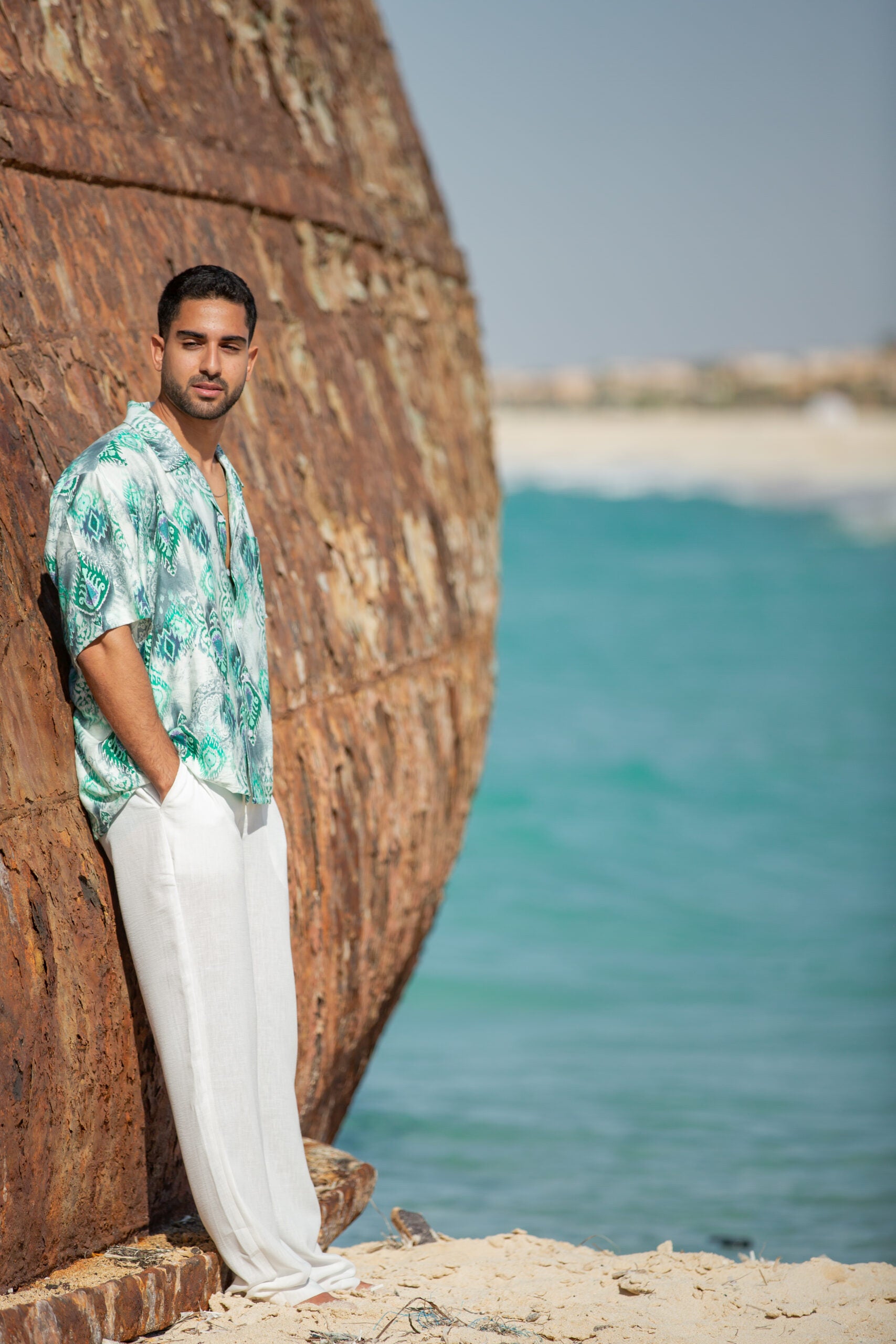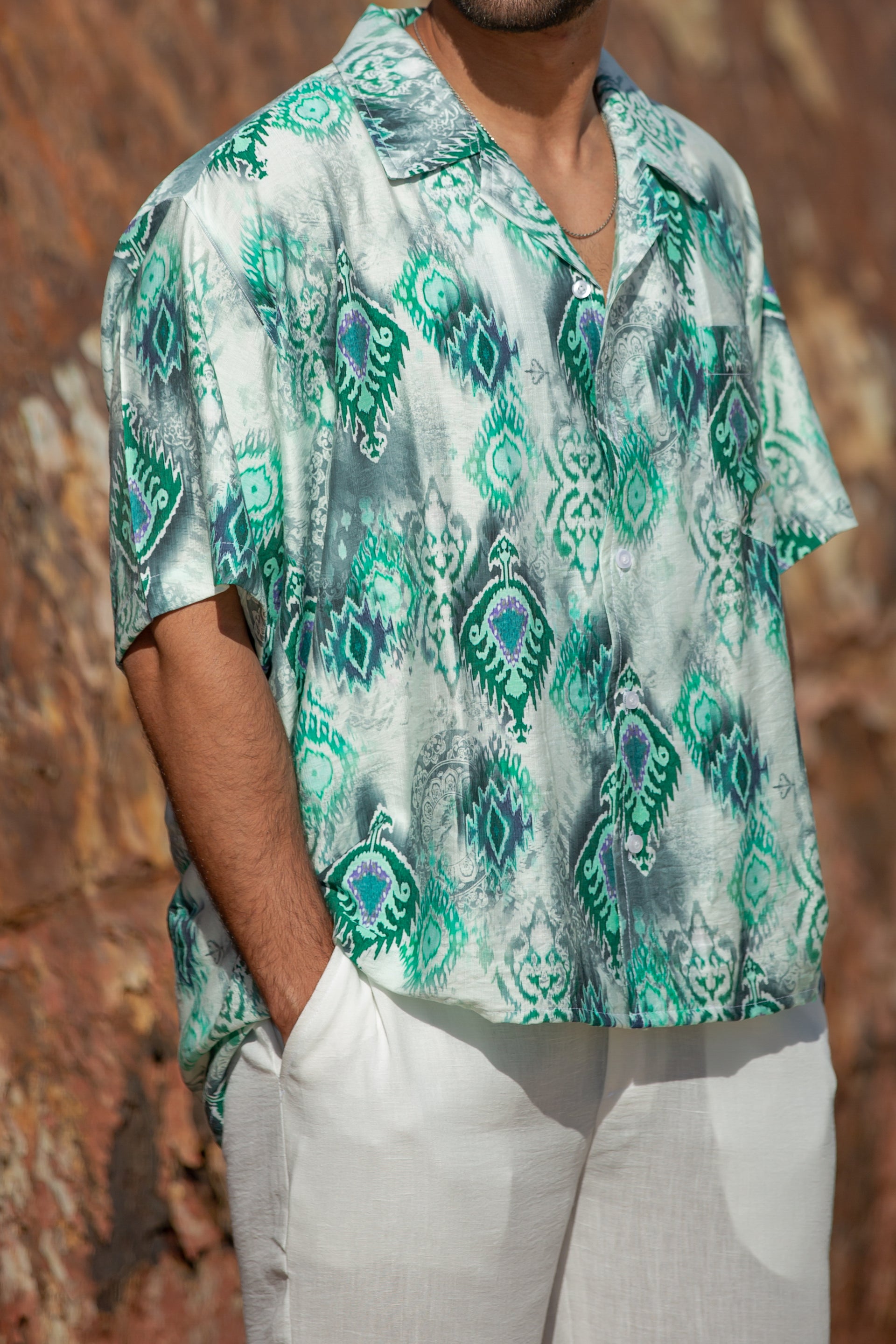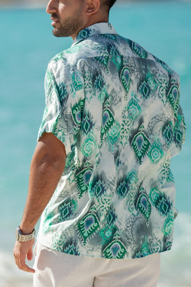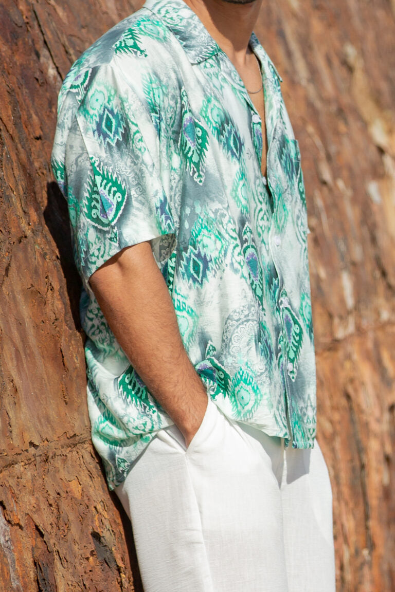 The Oversized Pattern Shirt, crafted from a durable yet soft blend of linen and cotton, exudes summer elegance. Its elegant design features cool colors and a charming pattern, all created with love.